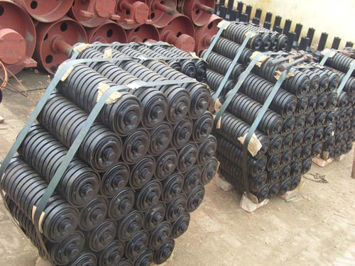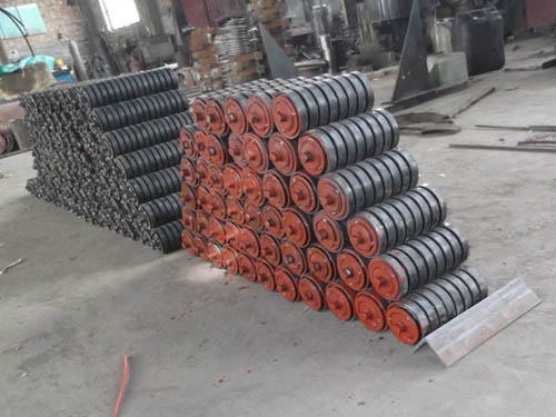 緩沖托輥安裝在輸送機受料段的下方,減小落料時物料對輸送帶的沖擊,以廷長輸送帶的使用壽命.緩沖托輥的間距一般100-600毫米。